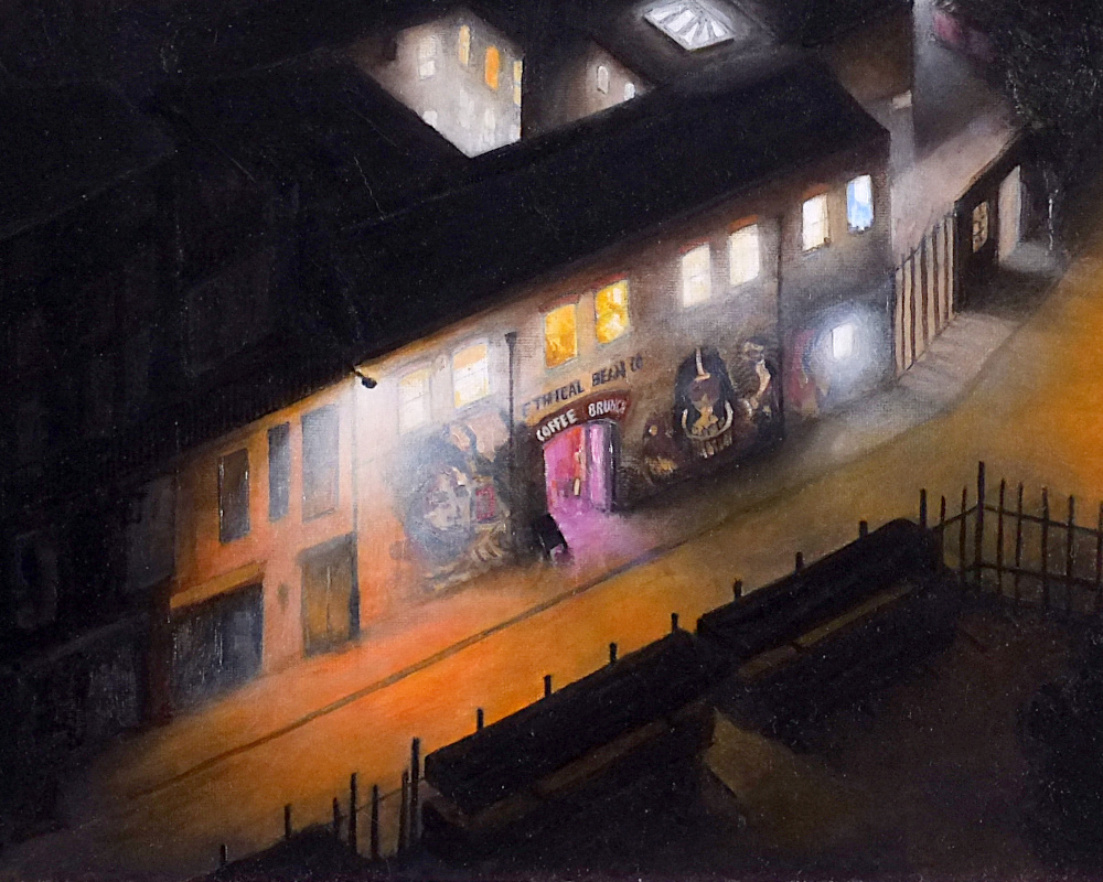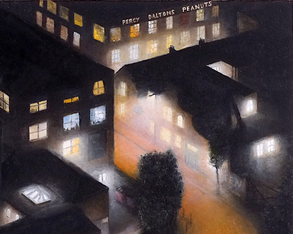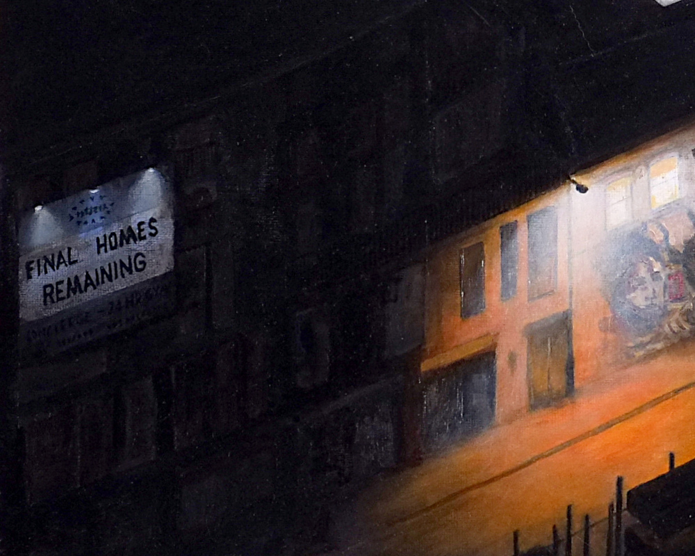 FINAL HOMES REMAINING is the fifth in the series of six paintings ‘SIX VISIONS OF HACKNEY WICK’ 2023-2024. The piece looks at Dace Road across the canal in Fish Island. Taking its name from the poorly chosen marketing banner on the new build flats in the area, this piece aims to contrast the light and life of the creative warehouses with the emptiness of the sterile new build apartments that now dominate the area.