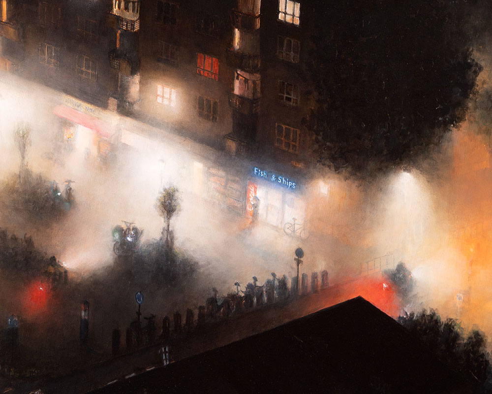 This scene is one I was really keen to capture, because it’s one I’ve cycled through so many times and have always been struck by the space that’s formed at the meeting of Bonner Road, Old Ford Road, and St Andrews Avenue in Bethnal Green. It’s an unusual little triangle of open space between the abandoned buildings of the Old London Chest Hospital, and the bustling life and busyness of the flats and houses that surround it.