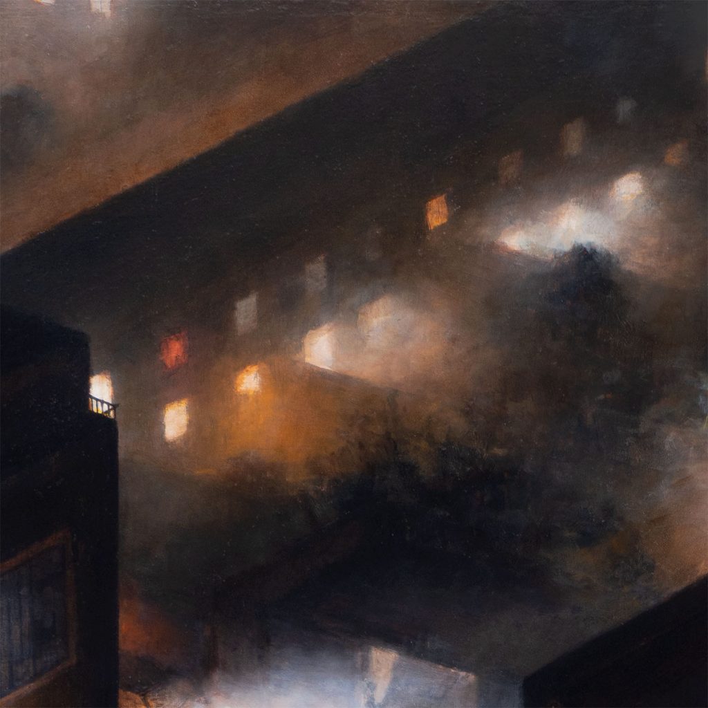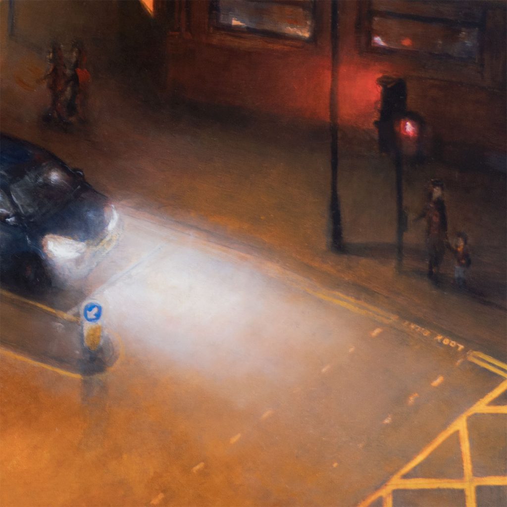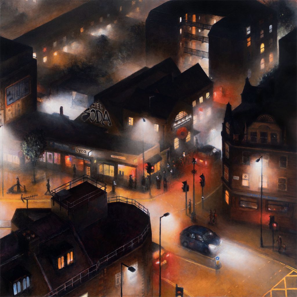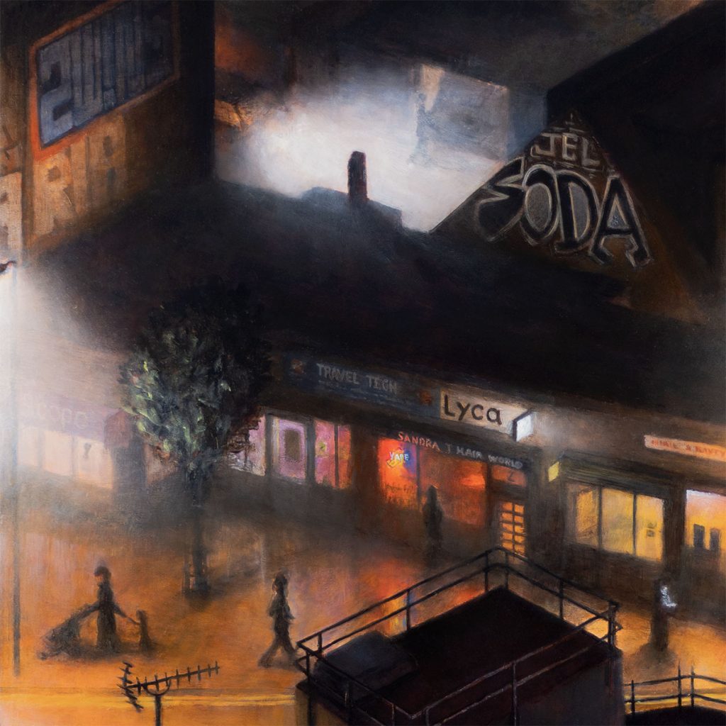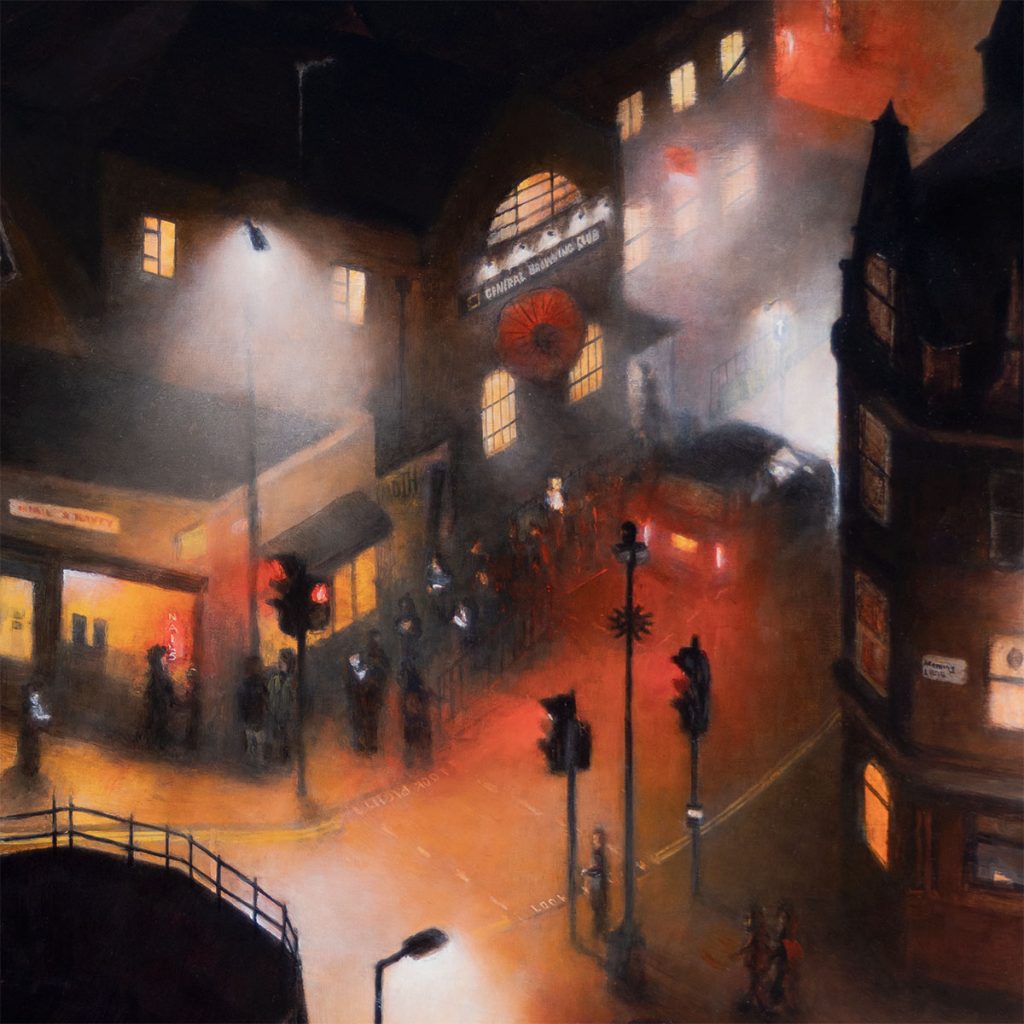 I wanted to paint the scene now, with the old row of shops intact and their current entrepreneurial shopkeepers still in place – shops which are integral services to Hackney’s diverse and global communities. I wanted to capture the growing queue outside the club as the excitement for the evening builds. People gathering and forming community together, illuminated by the street lights, brake lights, and phone screens. The title for the piece is taken from one of the banners hung on the railings outside the club ‘If you make noise outside, Moth Club won’t be able to make noise inside any longer… please respect our neighbours’, and we can only hope MOTH Club’s future neighbours practice the same philosophy.